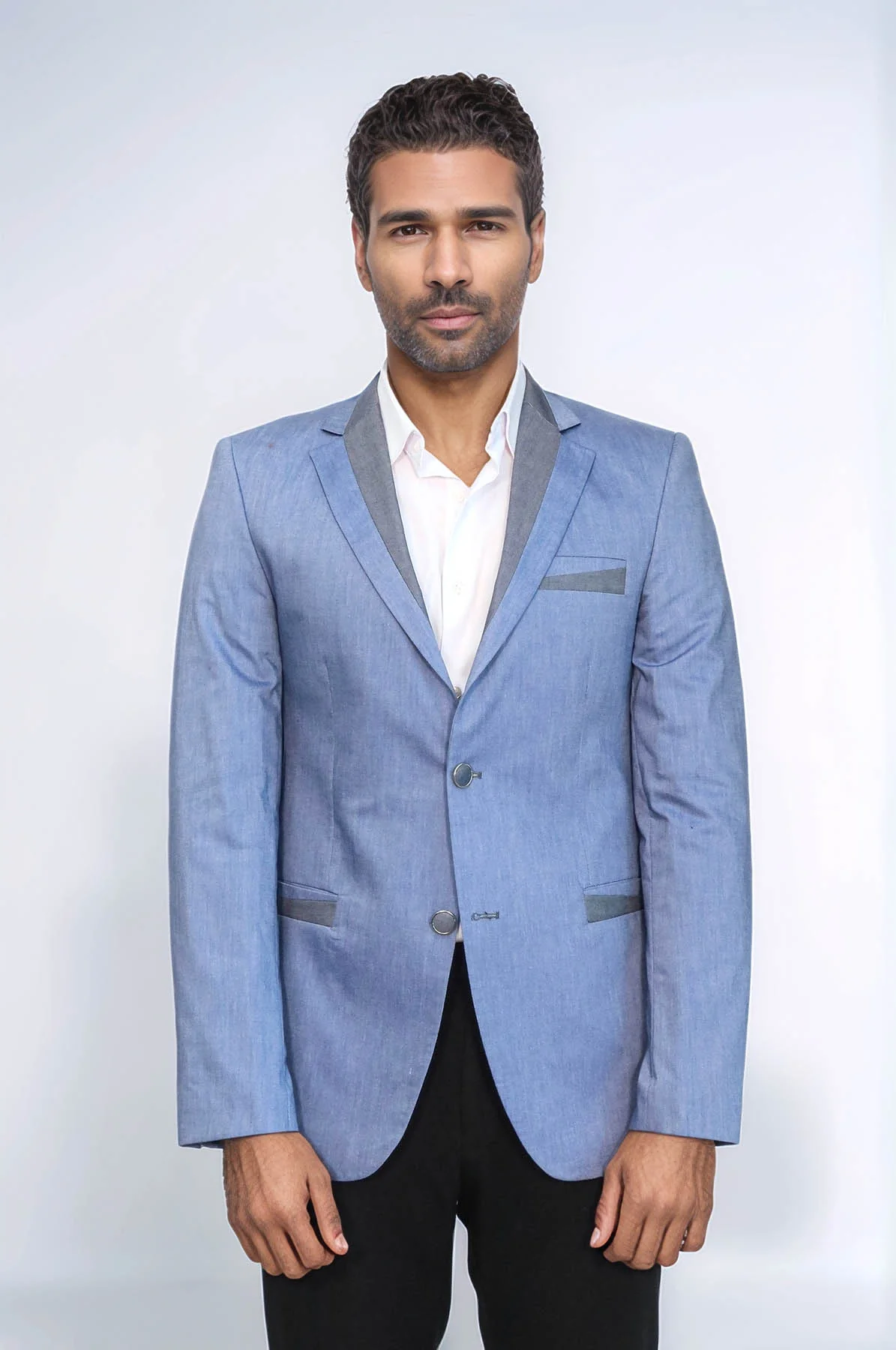 Sophisticated, functional, and stylish — Wessi's 3 pockets 2 buttons cross piping light blue jacket delivers contemporary elegance with expert tailoring. This refined blazer features a fresh light blue color with classic plain design, distinctive cross piping detail, notch lapel, and three convenient pockets that creates a sleek and modern appearance, perfect for casual business settings, smart casual occasions, formal events, weekend outings, social gatherings, and keeping your essentials close at hand.