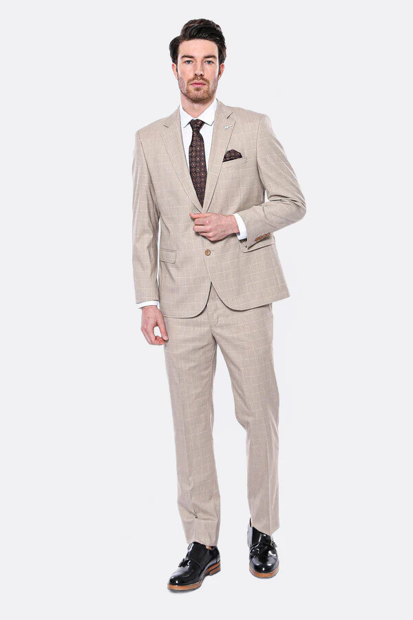 Men give priority to light shades for the summer season, and this beige checked suit is the perfect choice when you want to look stylish at a wedding or engagement ceremony. The self-patterned and plaid-looking design with classic cut supports your strong appearance while offering affordable luxury.