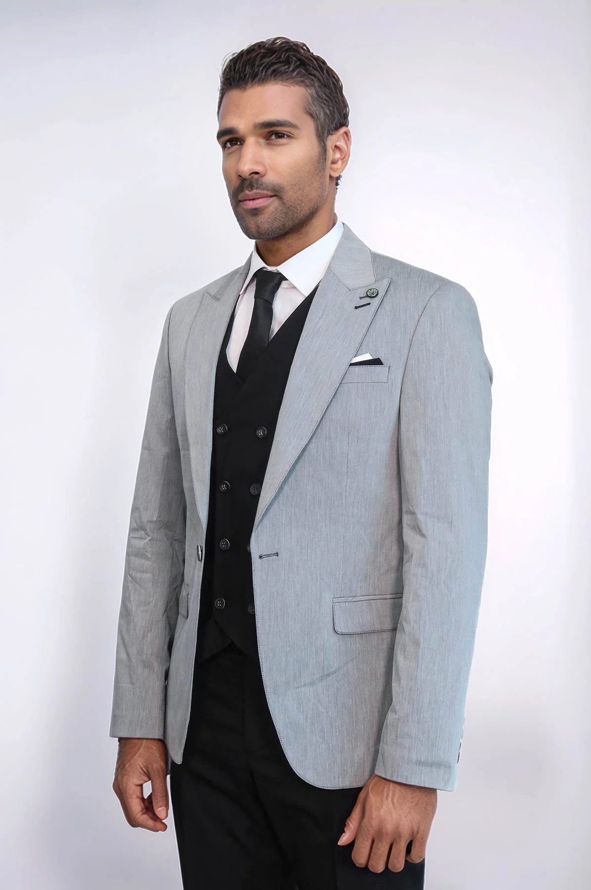Stylish, sophisticated, and distinctive — Wessi's grey 3-piece suit with black double-breasted vest delivers modern elegance with expert tailoring. This complete suit set includes a single button peak lapel jacket, unique double-breasted vest, and trousers, featuring a refined grey color with black vest contrast that makes a statement in any professional setting.