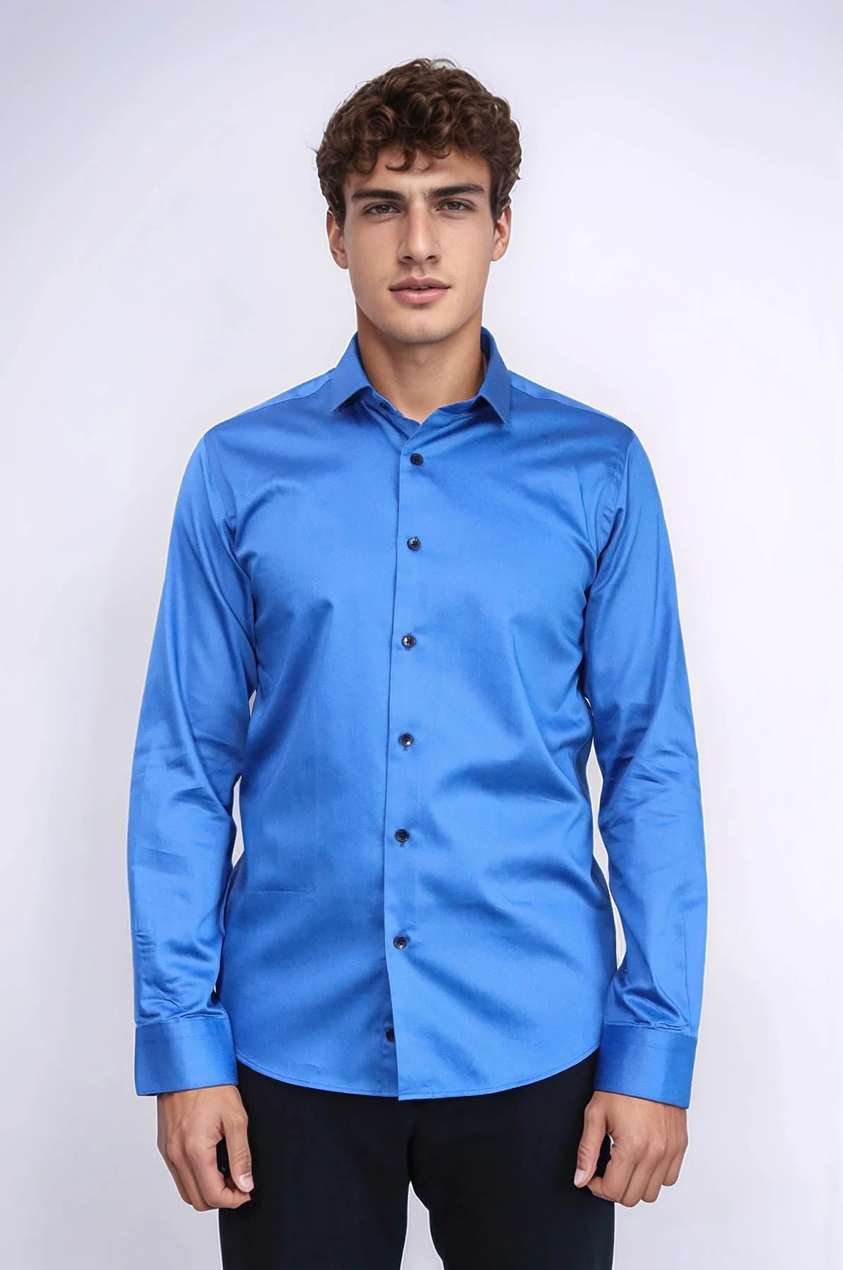 The satin blue shirt model is also available in navy blue, ice blue, cream, purple and pink colors on the website, but the product content is made of 100% cotton fabric blend and the fabric can appear shiny in light environments. It is produced with a slim fit shirt pattern, all size options are offered on the site, the long collar can be buttoned and there is no pocket option. Due to its fabric type, the shirt should be washed at a maximum of 60 degrees and ironed at 180 degrees.