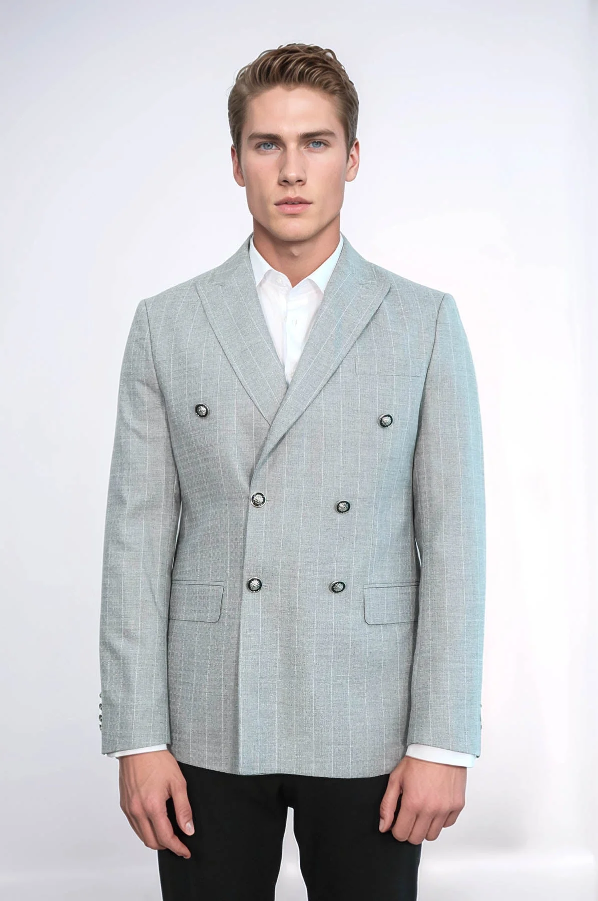 Sophisticated, elegant, and distinctive — Wessi's double breasted slim fit striped grey men blazer delivers refined elegance with expert tailoring. This refined blazer features a sophisticated grey color with modern white stripe pattern, luxurious double-breasted design with wide peak lapel, and modern slim fit that creates a sleek and sophisticated appearance, perfect for business meetings, casual business settings, smart casual occasions, formal events, office wear, weekend outings, and making a powerful statement with contemporary sophistication.