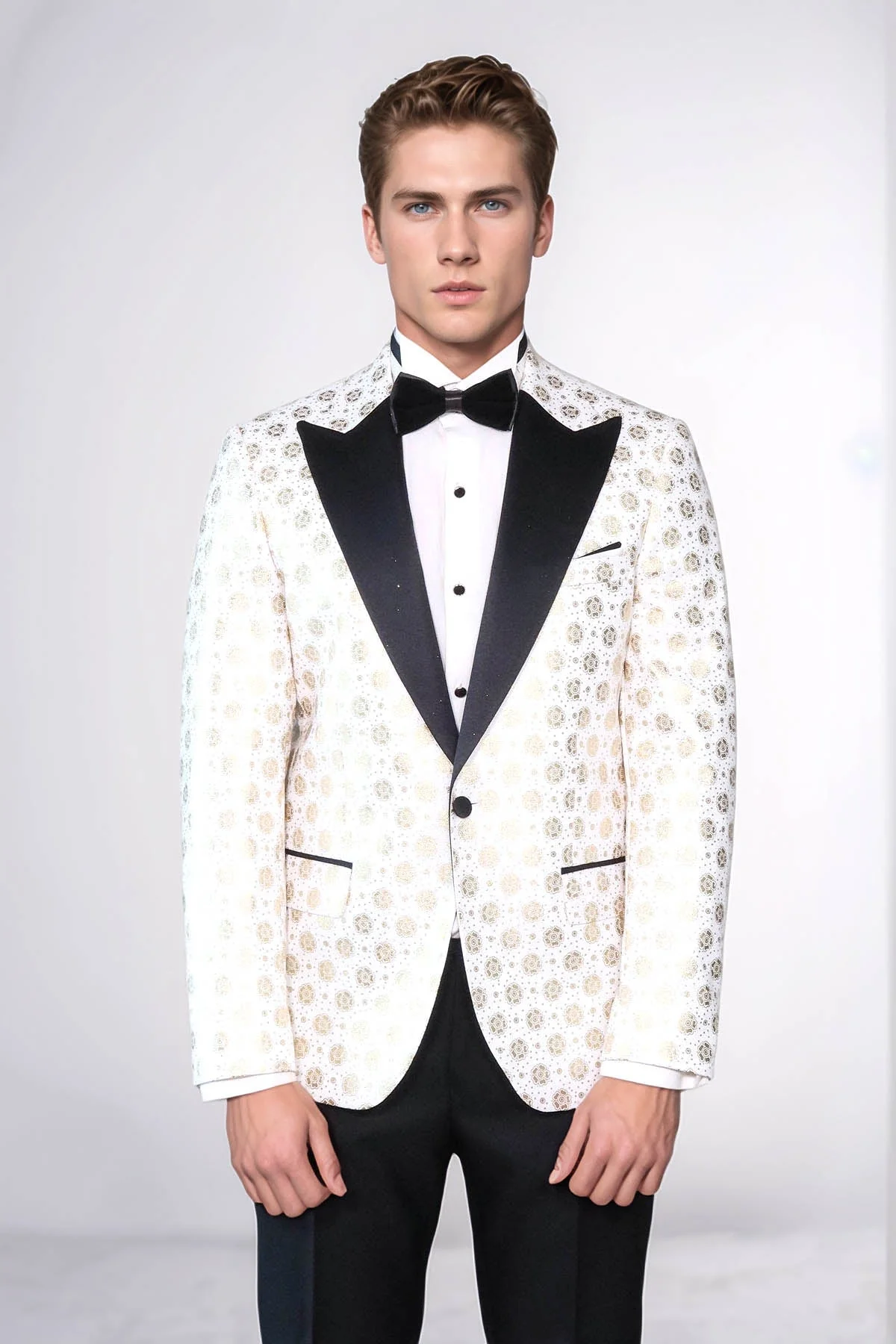 Floral Patterned Peak Lapel White Men Wedding Tuxedo Blazer - Wessi