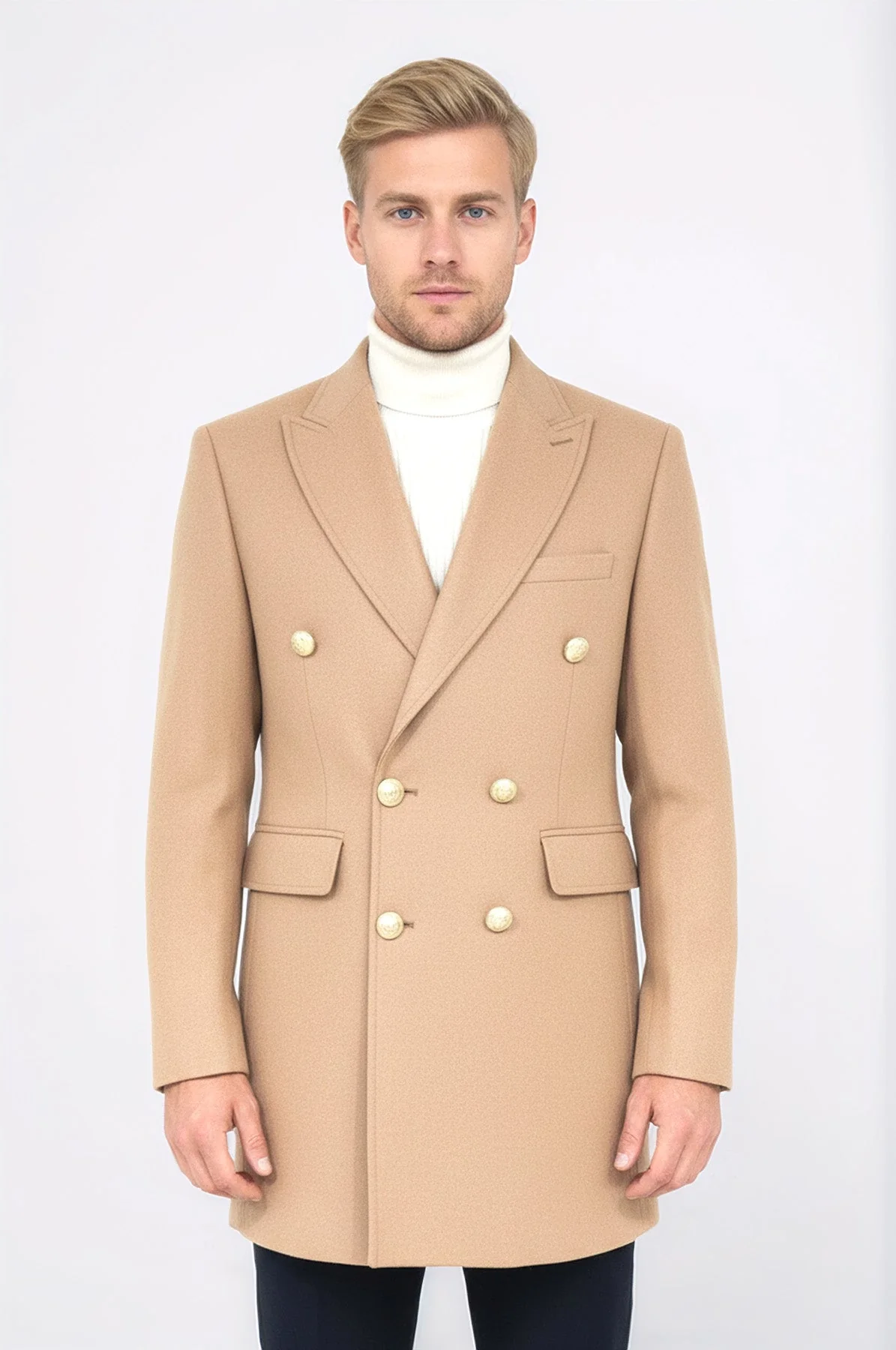 Expertly crafted, this Metal Buttoned Double Breasted Cream Men Coat by Wessi exudes sophistication and style. Made with high-quality materials, this coat features a double-breasted design and unique metal buttons for a touch of elegance. Stay warm and fashionable in any setting with this must-have coat.