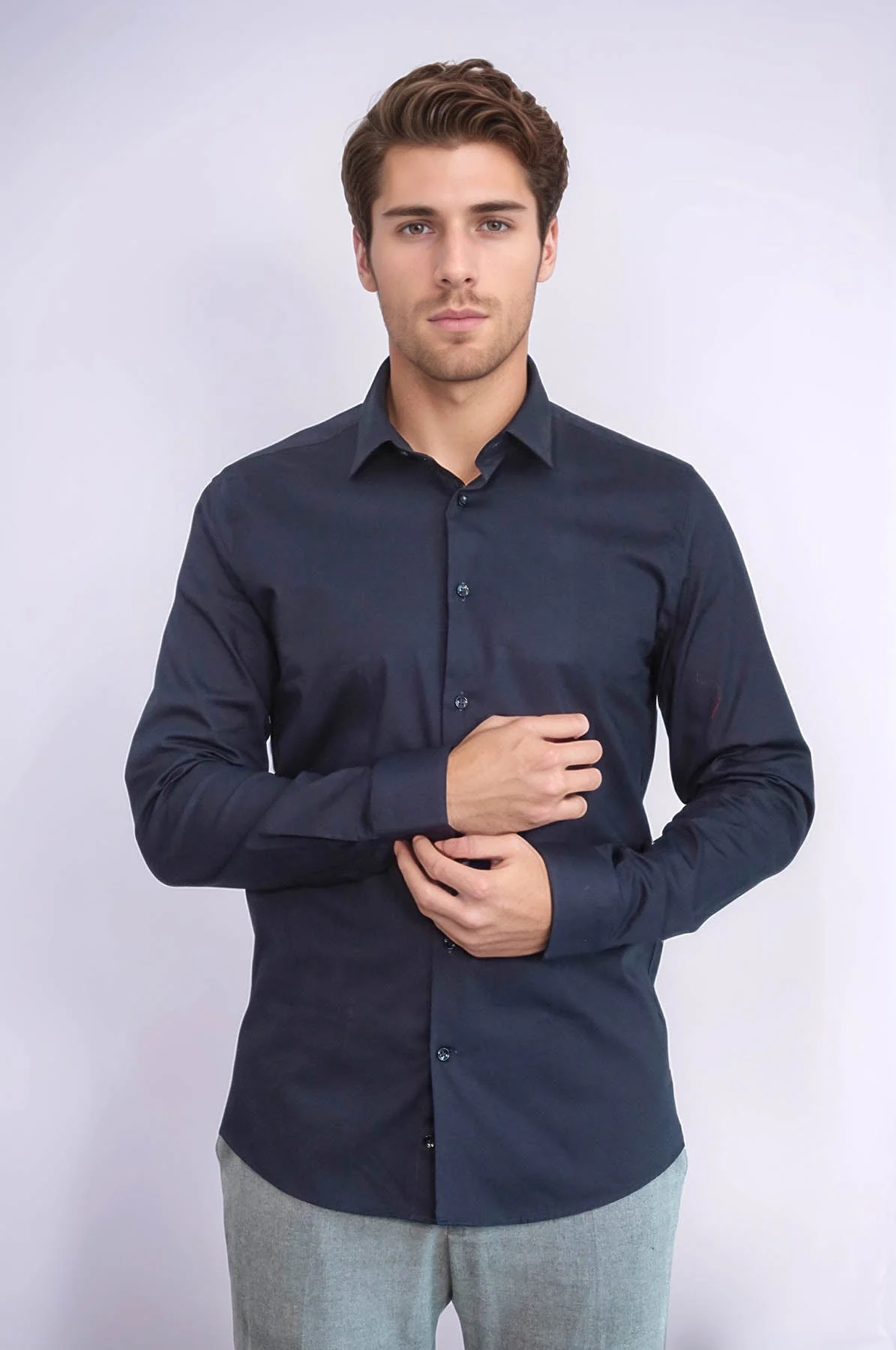 Monochromatic shirts have always been saviors. Men do not want to spend a lot of time for the combination. Therefore, they prefer shirts that are compatible with any color. Navy blue patternless shirts are also compatible with almost any color trousers and jacket. It is easily combined with all trousers in white, light blue, navy, and brown colors. When you want to complete a patternless shirt with a tie, patterned or patternless ties can be preferred.