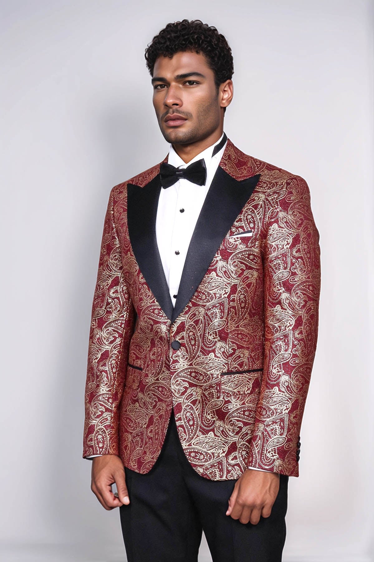Elevate your formal wardrobe with this paisley peak lapel burgundy men singer tuxedo blazer from Wessi. The distinctive paisley pattern combined with refined peak lapel design and rich burgundy color creates a sophisticated and eye-catching appearance that's perfect for any formal occasion, stage performance, or celebration. Made with high-quality materials and expert tailoring, this tuxedo blazer provides comfort and durability while ensuring you look your absolute best. Pair with dark trousers and dress shoes for a sophisticated formal look that commands attention.