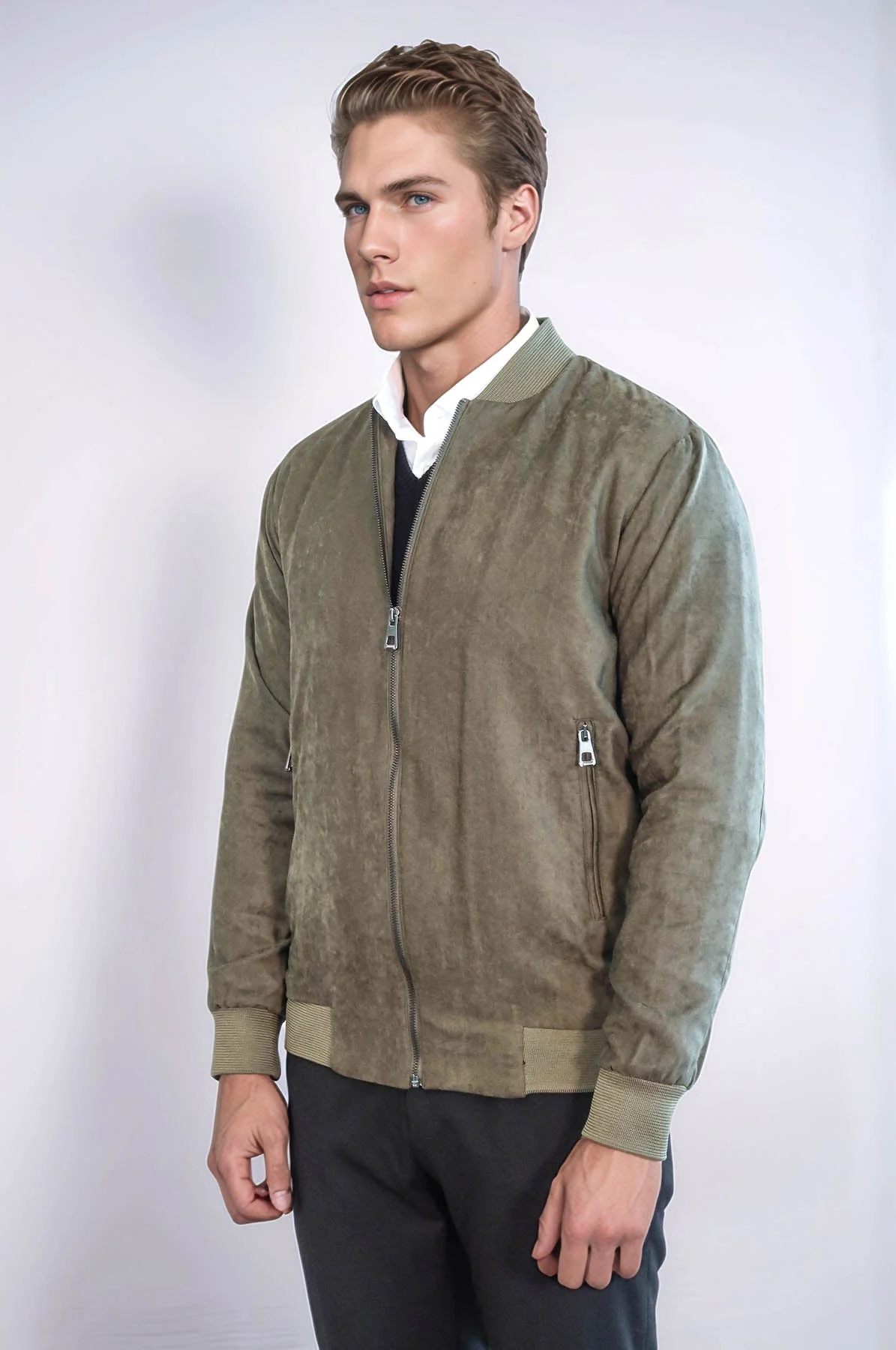 Bomber jackets can be worn in different styles when combined with shoes such as sneakers or leather boots. They offer both comfort and elegance at the same time. This men's light green patternless bomber jacket with zipper pockets is a great option for men who want to add comfort and vibrancy to your style. When wearing this light green bomber jacket, you can choose a t-shirt or shirt in a contrasting color underneath. For example, a white or gray t-shirt can liven up this outfit. For the underwear, consider a pair of light-colored chino pants or beige linen shorts. For shoes, you can choose comfortable shoes or white sneakers. Don't forget to add a matching bracelet or wristwatch to add some color to your style. This outfit is ideal for a stroll with friends, a light walk or a cozy cafe date. The light green bomber jacket offers comfort while revitalizing your style.