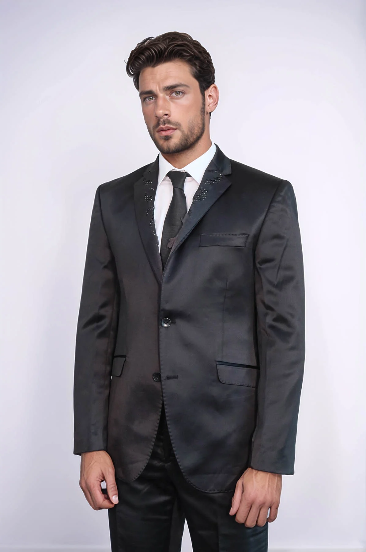 Elegant, sophisticated, and luxurious — Wessi's two piece two buttons modeled lapel satin black men groom suit delivers refined luxury with expert tailoring. This complete 2-piece suit set includes a jacket and trousers, featuring a classic black color with luxurious satin fabric and modeled lapel design that creates a sleek and sophisticated appearance, perfect for weddings, groom attire, formal events, galas, special occasions, and making a powerful statement with contemporary elegance.